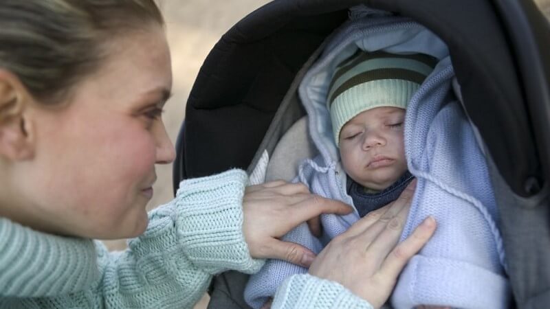 Để tránh gió tạt vào mặt khiến bé bị khô nẻ, bạn nhớ trùm khăn mỏng che mặt cho bé hoặc sử dụng tấm che xe đẩy khi đưa bé ra ngoài nhé.